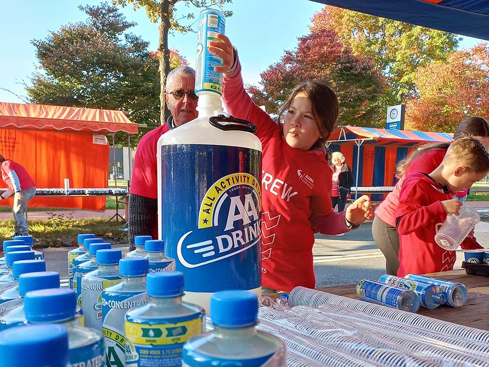 Een geolied team dat precies weet wat te doen! Om 8.30 uur verzamelen, gezellig bijbuurten terwijl er gewacht wordt op de aanlevering van alle benodigde materialen, met z’n allen bekertjes vullen met water en AA en dan vol enthousiasme de lopers van de hele marathon voorzien van het gewenste drankje.