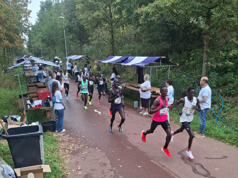 Behalve water aanreiken was het ook weer bijzonder leuk om te zien wat er zoal allemaal langs komt lopen. Allereerst de kopgroep van ongeveer 15 renners met voornamelijk Kenianen met daarin de drie toppers Kipkemoi 2:06:33, Ronoh 2:08:32 en Mwei 2:08:56.