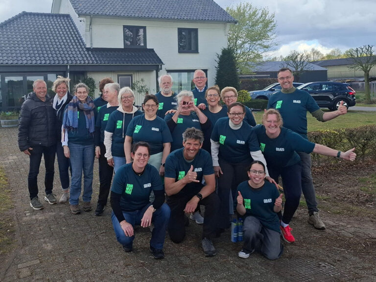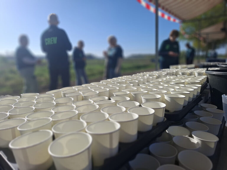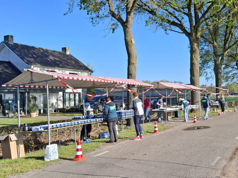 Op de 10km post was een Kindia ploeg van zestien vrijwilligers paraat om de lopers te verzorgen. De kraampjes waren al klaar gezet door de Golazo Sport mensen. Dit jaar was de verzorgingspost opgesteld bij de boerderij van Frank en Ingrid. Onze auto’s mochten we op hun plak parkeren. Bij aankomst werden we door hen onmiddellijk verwend met koffie, echt zóó gastvrij Brabants!