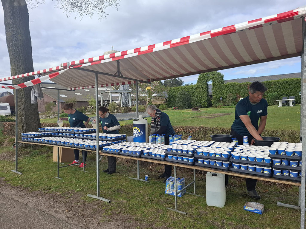 Daarna aan het werk: bekertjes uitstallen in de kraampjes en vullen met water en AA-drinks. Water voor de runners mochten we allemaal tappen bij ons gastvrije koppel!