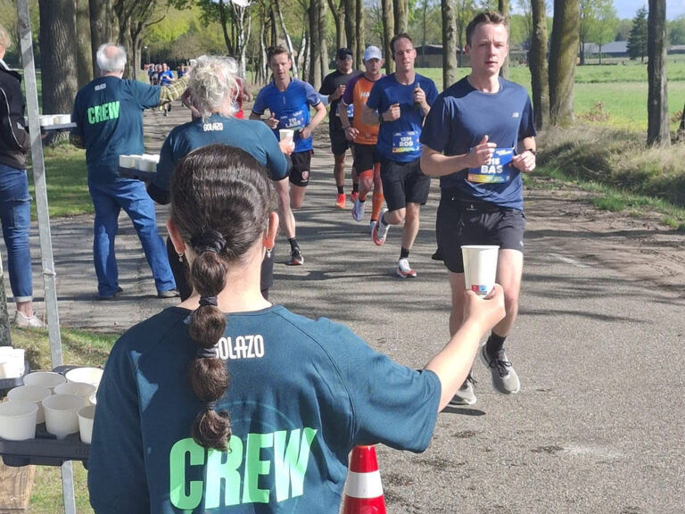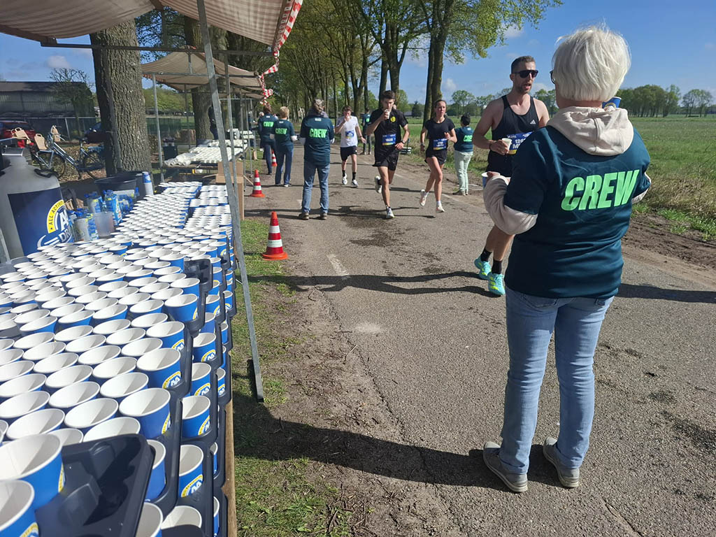 Ook bij het uitreiken aan de lopers kwamen Frank en Ingrid ons helpen, zomaar twee extra vrijwilligers erbij. Het uitdelen van drank en aanmoedigingen is ook wel het allerleukste om te doen. De hollende dames en heren zijn altijd zo dankbaar voor de verfrissingen.